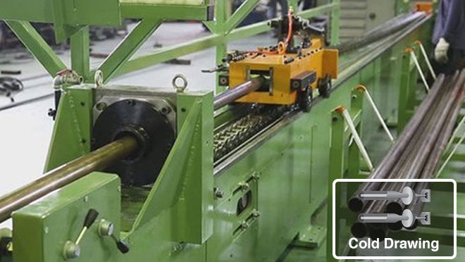Process of pulling of pipe from die and plug in order to manufacture precise dimension of the tube. This process is carried out by using cold draw bench.